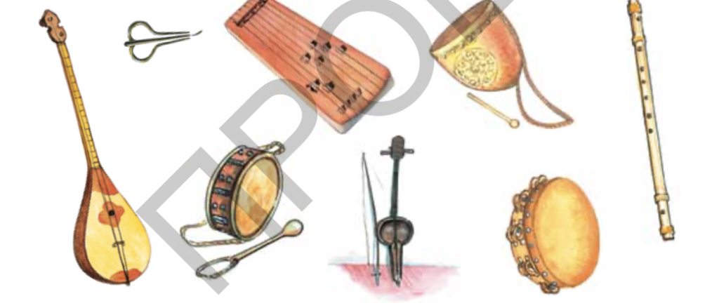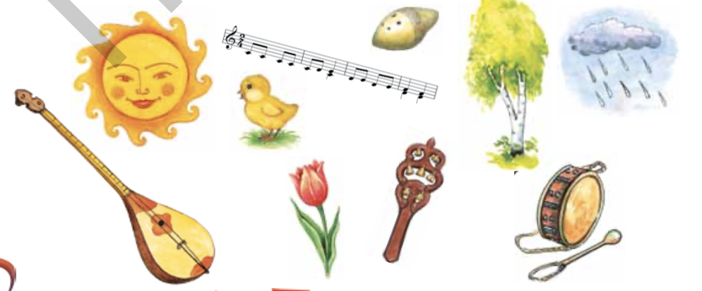 салынған заттар (мысалы, музыкалық аспаптар, музыкалық шығармалар, әндер).